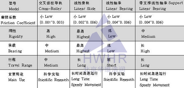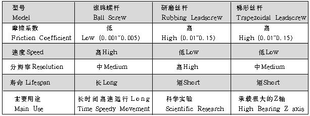 电控平移台的关键部件是传动螺杆,导轨,机体材质,加工精度,以及整机装调工艺水平对电控平移台的品质有较大的影响。 传动螺杆大多采用滚珠螺杆、研磨丝杆和梯形丝杆。滚珠螺杆与螺母通过钢球实现滚动传动,运行平稳,传动效率高,易实现高速运行。研磨丝杆和梯形丝杆的螺杆与螺母之间滑动传动,研磨丝杆可采用小导程提高系统分辨率。梯形丝杆传动力矩大,能够实现自锁,特别作为垂直轴使用效果更好(承载大、断电自锁)。