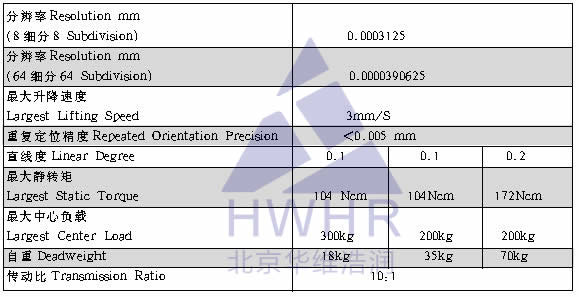本产品采用滚珠螺杆和减速机驱动,四根线性轴承做导轨,升降高度大,稳定性好,精度高,承载大。
