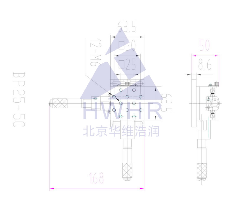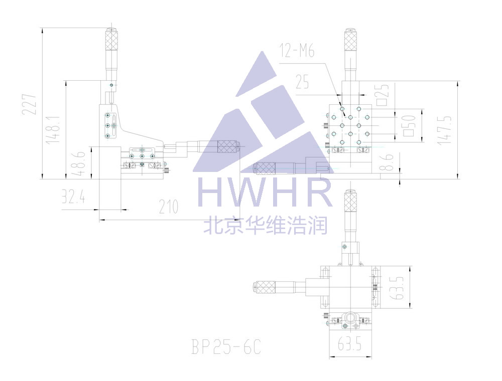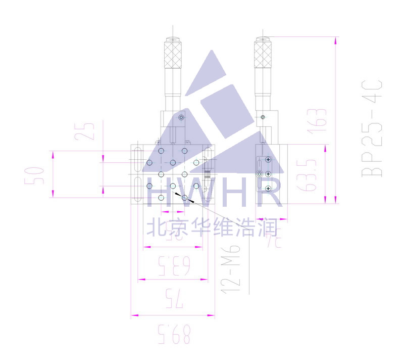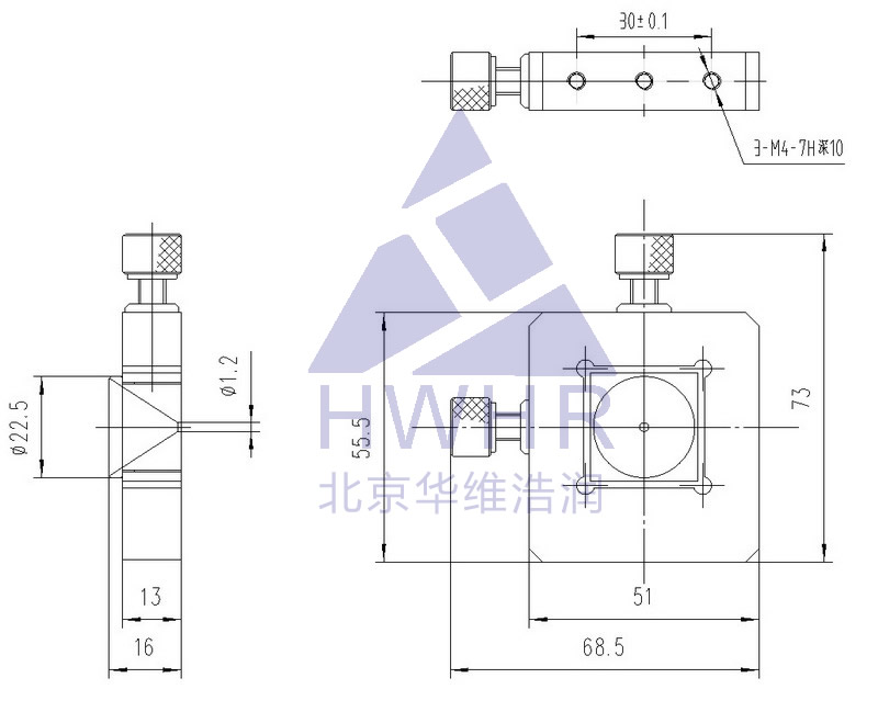 实现微小位移,采用M6X0.25微调螺纹副驱动,体积小,中间有ф1.2的小孔用于滤波,也可安装显微物镜等其他部件。