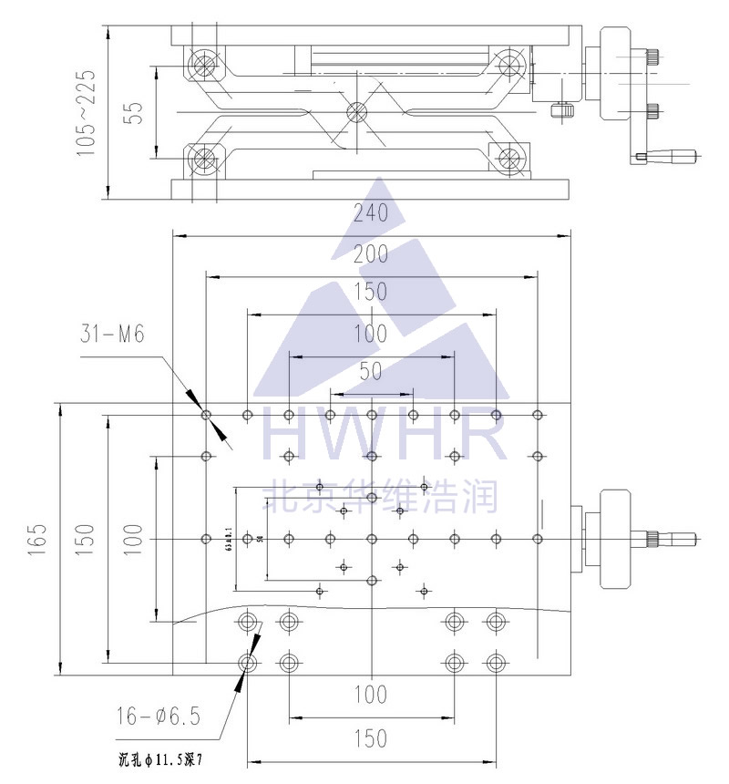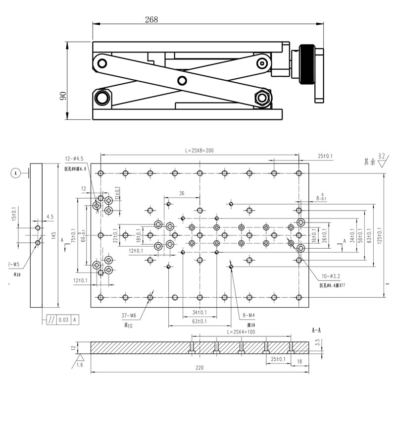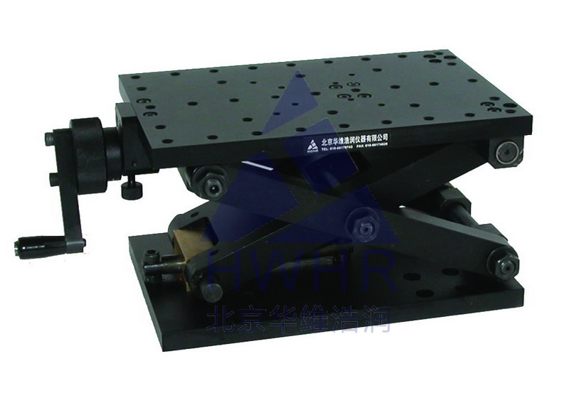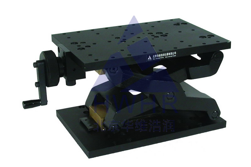 本产品采用剪式升降支撑,精研双燕尾副作为导轨,过五轴研配连动定位,精研丝杠驱动,并配有锁紧手轮。使得平台升降平稳,并锁紧在任意位置,台面与底板的平行基本不变,整个升降平台在升降过程中不会出现晃动。刚性结构好,稳定性好,适用于高精度光学系统。