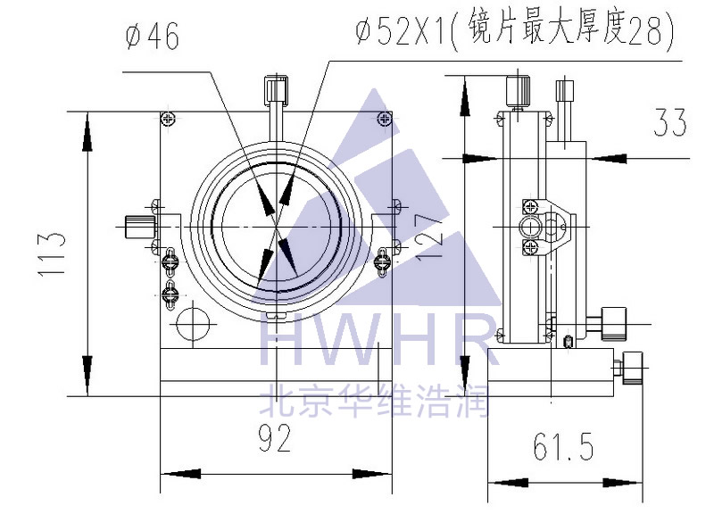本产品可提供XYZ三轴平移调整Tx,Ty,Tz和绕Y、Z轴的正交共面调整θy, θz。特殊设计保证Tx调整快速稳定,并可锁紧,Ty,Tz调整采用M4X0.3细牙螺杆,θy,θz调整采用M6X0.25微调螺纹副,调整精细。安装孔为M52X1标准螺纹孔,通用性强。