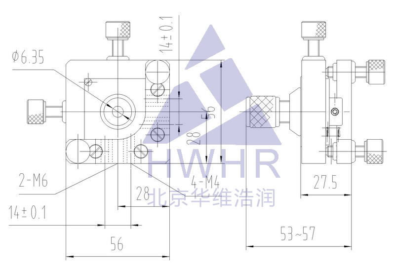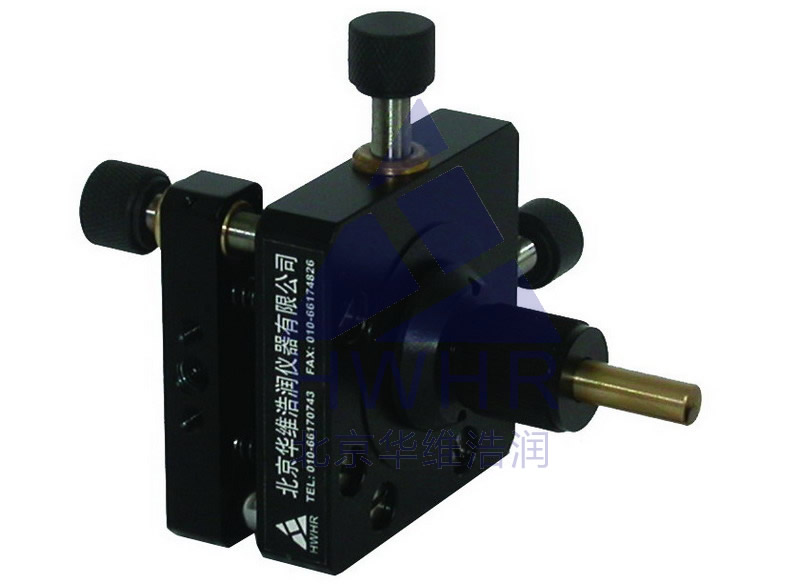 可对光纤进行的五维调整。以光纤轴向为X轴,此耦合器可沿X、Y、Z方向直线调整Tx、 Ty、 Tz,绕Y、Z轴倾斜调整θy、θz。Ty、Tz、 θy、 θz采用M6X0.25细牙微调螺纹副调节,Tx采用0.5螺距细牙螺杆调节,调整精细,稳定,重复性好。X轴位置为Ф6.35mm通孔,可装卡本公司生产的FG系列光纤卡头。